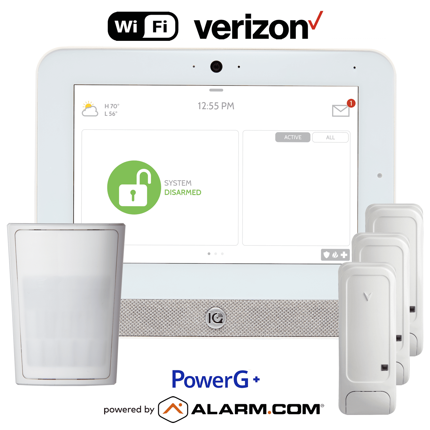 This IQ Panel 5 wireless security system kit includes; (1) wireless touchscreen control panel IQP5017 with built-in Wi-Fi/Cellular Alarm.com Verizon alarm communicator, (3) wireless PowerG door/window contacts PG9945 and (1) wireless pet-immune motion detector PG9914. With dual-path alarm communications, primary Wi-Fi that is backed up by cellular Verizon LTE, the IQ Panel 5 security system provides for redundant signaling that is less susceptible to line tampering.